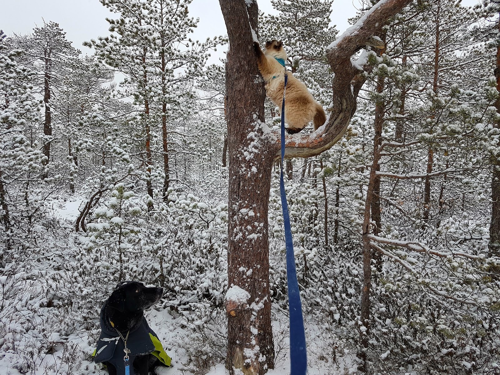 Pessiä selvästi harmitti, kun annoin koirien juosta hetken vapaana. Hommahan ei ollut nyt lainkaan kissan hallinnassa 😎
